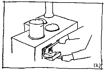 3. On prépare le feu en plaçant d'abord des copeaux ou du papier dans le foyer avec du petit bois et, au-dessus, des bûchettes convenablement fendues.