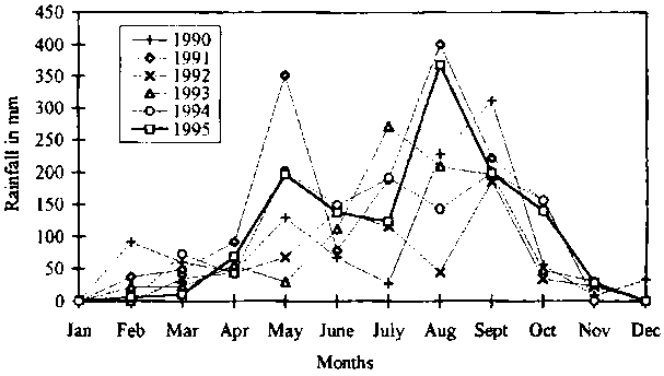 Figure 4: Annual rainfall pattern per year for 1990-1995, Tamale, Ghana