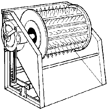 This prototype model uses a centrifugal blower fan to separate the grain from the chaff. The improved model works at about 99% winnowing efficiency. An integral motor is included and the machine is freestanding. Throughput: 466kg per hour.