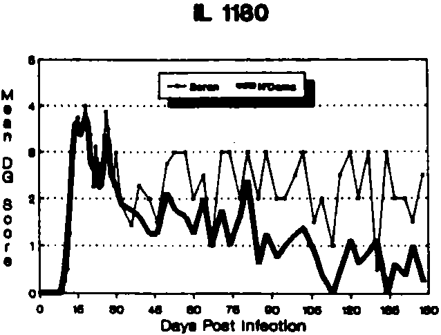 During the first exposure of the Boran to IL 1180 (Group 2) in May 1985, six of eight animals required Berenil treatment. Two years later this same group of cattle exposed to the same IL 1180 resulted in four of the eight requiring treatment. The average number of days to treatment in the first challenge was 41 days and 63 days in the second.
