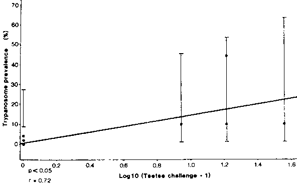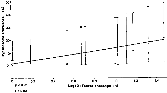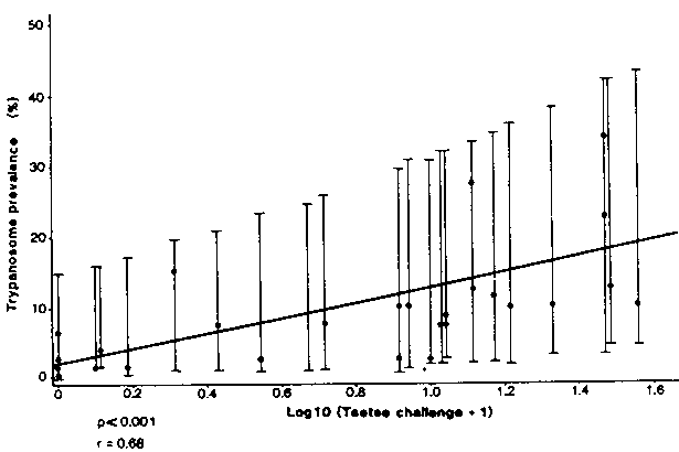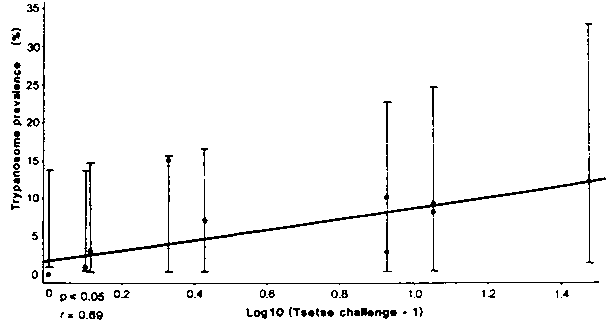 As numbers of tsetse captured were low in many villages, particularly in Tengrela prefecture, insufficient tsetse were dissected to give monthly estimates of trypanosome infection rates for tsetse at all villages. For this reason analyses of mean annual estimates are reported. The relationship between tsetse challenge and trypanosome prevalence was examined using linear regression analysis. An arcsin transformation of trypanosome prevalence estimates was used in order to stabilize the variance, and these estimates were regressed on a log10+1 transformation of tsetse challenge.