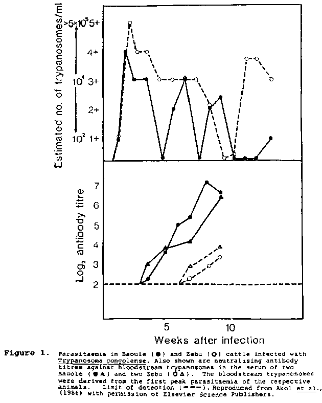 As parasitaemia wave remission is effected by antibodies directed against the surface coat antigens of the trypanosome (reviewed by Murray and Urquhart, 1977), it is generally assumed that the superior capacity of trypanotolerant animals to control parasitaemia is associated with a better immune response, al-though in cattle, at any rate, there are only a few preliminary studies in N'Dama infected with T. vivax (Desowitz, 1959) and Baoule (West African Shorthorn) infected with T. congolense (Akol et al., 1986) which suggested that this might be the case.