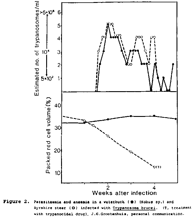 Certain species of wild Bovidae can develop high levels of parasitaemia following trypanosome infection, e.g., waterbuck (Kobus sp.) infected with T. brucei. Despite this, no significant changes in red cell numbers occurred, in contrast to the severe anaemia in a trypanosusceptible cow with equivalent levels of parasitaemia (Figure 2). These findings might suggest that the waterbuck red cells were more resistant to the destructive effects of the trypanosome.