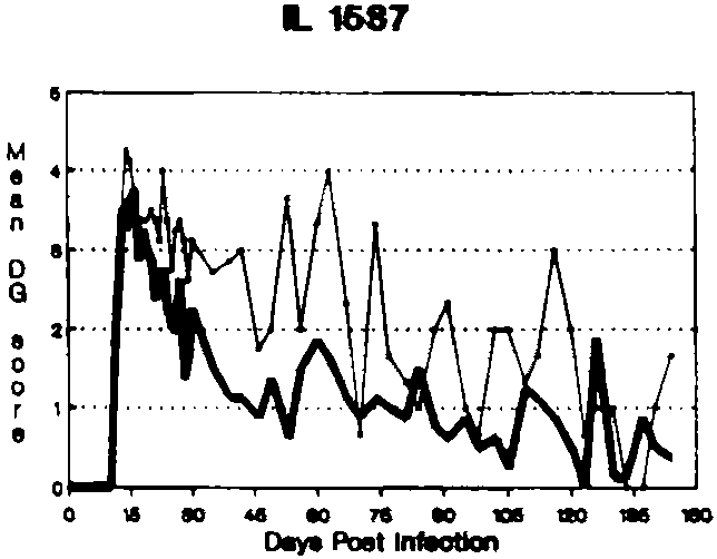 The average number of parasites per ml blood during the first parasitaemia peak was significantly lower (P<0.05) in N'Dama than in Boran (score average 4.00 versus 4.32, equivalent to approximately 2.5 and 7.8x10 trypanosomes/ml, respectively). The pattern of parasitaemia during each of the four infection periods in N'Dama was similar and could be divided into three phases (Figure 1). During the first phase (day 1-34), the onset of parasitaemia was followed by the first and highest peak thereafter the parasitaemia gradually dropped to 5.5x103 trypanosomes/ml (score of 2). A similar reduction in the level of parasitaemia took place in the Boran during this period. During a second phase (day 35-140) the six out of 32 Boran that did not receive treatment continued to have an average parasitaemia of approximately 5.5x10 trypanosomes/ml (score 2). During the second phase 26 of 32 Boran required treatment (day 42, std. 10). In contrast, the N'Dama entered a second phase (day 35-80) in which a further decline in parasitaemia occurred. By day 80, parasitaemia in N'Dama had dropped to very low levels (score below one) and intermittent parasitaemia continued until final treatment. Over the four infection periods, the overall mean parasitaemia score for the N'Dama was 2.10. This was significantly lower (P<0.05) than the score of the three untreated Boran in Group 2 (2.72). Within the group of N'Dama's, there were individual animals which consistently had significantly lower mean parasitaemia levels than the rest of the group. During the second IL 1180 challenge five of eight N'Dama became parasitaemia on day 18, peaked on day 22 post-infection and thereafter parasites were sporadically detected in the blood between days 22-67 (Figure 3). Between day 67 - 105 no parasites were detected in any of the N'Dama cattle. Six of eight Boran (Group 2) that were rechallenged with IL 1180 and both naive Boran (Group 6) became parasitaemia on day 12 and peaked on day 20. Four of the rechallenged Boran required treatment and two became aparasitaemic from day 87 onward. In the naive Boran group one animal was treated at day 80 and the second remained parasitaemia until the end of the 105-day period. The parasitaemia levels of the Boran in both challenges were not significantly different.