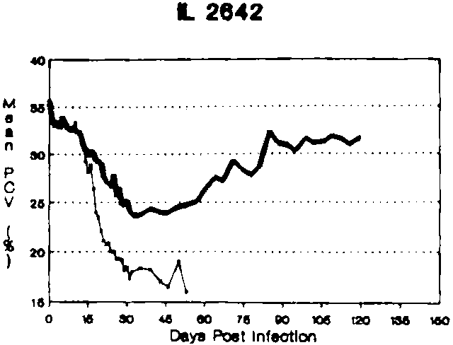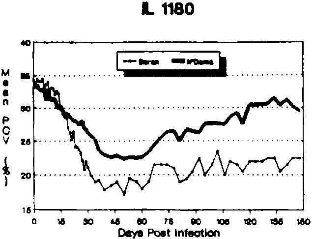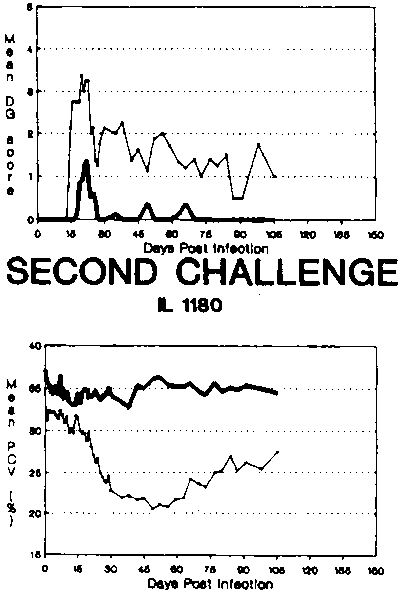 A comparison of the PCV values of the first and fifth challenge (Figure 3) show that in the second IL 1180 challenge the N'Dama began with a PCV of 37% and remained stable over the 105-day period with the lowest level reached being 29%. Six of eight Boran in Group 2 required treatment when their PCV dropped to 15%.