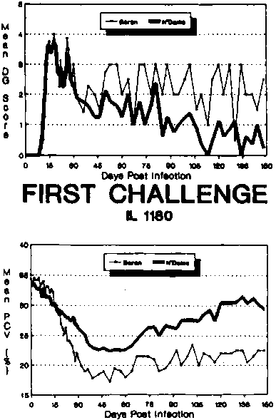 During the first exposure of the Boran to IL 1180 (Group 2) in May 1985, six of eight animals required Berenil treatment. Two years later this same group of cattle exposed to the same IL 1180 resulted in four of the eight requiring treatment. The average number of days to treatment in the first challenge was 41 days and 63 days in the second.