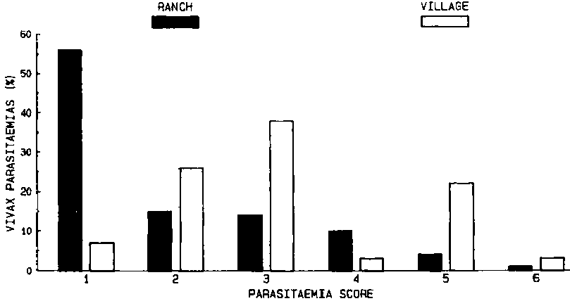 Intensity of T. vivax parasitaemia, measured on a scale from 1, low, to 6, high, was lower in ranch cattle (mean score 1.9) than in village cattle (3.2; Figure 1) and in village sheep (3.5). The cattle breeds, N'Dama and Race Locale, had similar parasitaemia scores in both management systems.