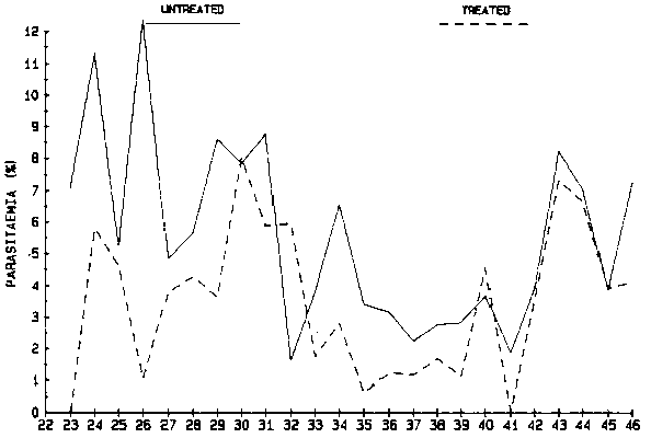Figure 1 shows the monthly prevalences of trypanosome parasitaemia for the prophylactic and control groups during the first two years of the comparison. Prophylaxis reduced mean monthly detectable parasitaemia from 5.7 to 3.5%, a reduction of 39%.