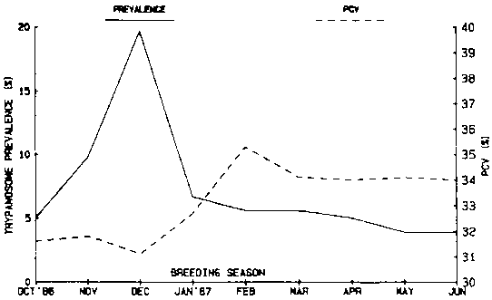 Figure 1. Mean monthly trypanosome prevalence (%) and PCV (%) of non-prophylactic N'Dama cows.