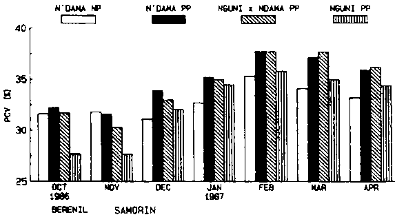 Following Samorin treatment in November PCV was higher in all three breed groups and higher than that of the N'Dama control population. The superiority was maintained over at least a five month period to April 1987 as shown in Figure 2.