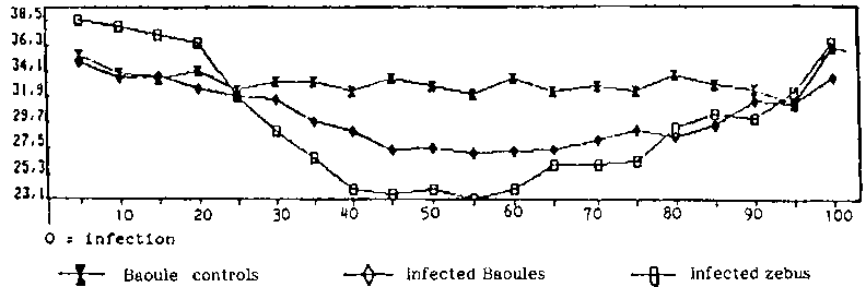 The four zebus which were not treated during the experiment had PCVs of 38.5% at the beginning of the infection and 23.1% around the 55th day. After the 55th day, PCV rose gradually and reached the same level as that of the infected Baoules (29.1%) on the 80th day.