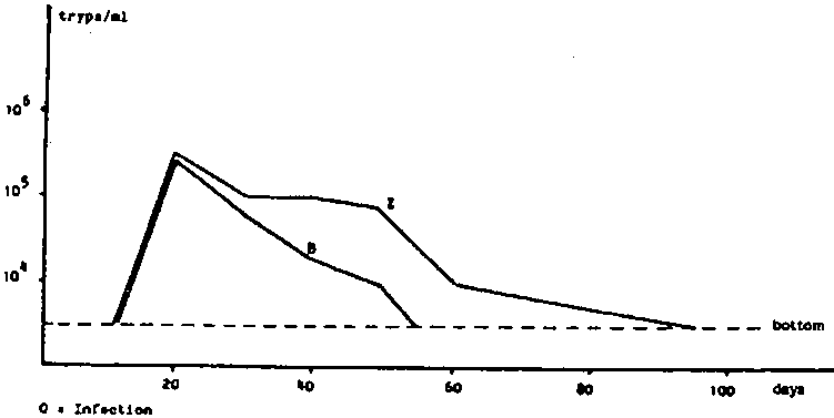 The animals were monitored by regularly checking weight, body temperature, skin reactions, PCV and parasitaemia as well as specific immune responses by the complement lysis test. One zebu (No. 698) was treated with Berenil (R) on day 31 following infection due to a poor general condition and a PCV of 20%. All the other animals, including the controls, were treated with Berenil (R) at the end of the experiment on 10/7/86. This date, chosen for logistic reasons, corresponds with days 80 and 93 following infection, depending on the animals.