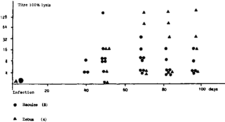Results are shown in Figure 5. We have shown serum titres producing 100% lysis with complement. The response of zebus appears to be as high (titre) as that of the Baoules, but appears later (80th day vs 60th day). These are just preliminary results and immune responses of animals in this monitored experiment should be studied in greater depth.