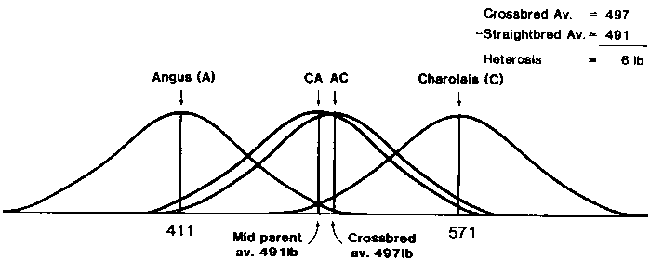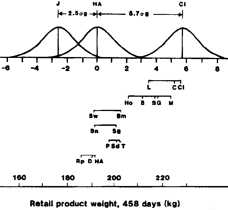 The additive genetic variation that exists among and within breeds of cattle for many production characteristics is vast. Results from the Germ Plasm Evaluation Program at the Roman L. Hruska U.S. Meat Animal Research Center are shown in Figure 1 for one important measure of output, retail product weight (closely trimmed-boneless steaks, roasts and lean trim). In Figure 1, F1 cross means for weight of retail product at 458 days of age are shown on the lower horizontal axis. The spacing on the vertical axis is arbitrary, but the ranking from the bottom to top reflects increasing increments of mature size. Steers sired by bulls of breeds with large mature size produced significantly more retail product weight than steers sired by breeds of small mature size. Differences are doubled in the upper horizontal scale to reflect variation among pure breeds relative to a standard deviation change in breeding value (s g=(s 2p) (h2)) within pure breeds. Frequency curves, shown for Jersey, the average of Hereford and Angus, and Chianina, reflect the distribution expected for breeding values of individual animals within pure breeds. The breeding value of the heaviest Jersey is not expected to equal that of the lightest Chianina and the heaviest Hereford and Angus would only equal the lightest Chianina in genetic potential for retail product growth to 458 days. The range between breeds (8.2s g) exceeded that expected for breeding value of individuals within breeds (6s g). Both between and within breed sources of genetic variation were large and important for this measure of output-retail product weight. Similar results have been found for other biological characteristics important to beef production.