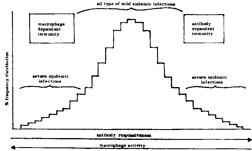 On the basis of their results, Biozzi et al. (1982) have proposed a theory for the evolution of host-parasite interactions in genetically heterogeneous populations (Figure 2). They proposed that F2 hybrids between homozygous H and L mice would present a normal frequency distribution of phenotypes, similar to that which is expected in genetically heterogeneous natural animal populations. The axes would have inversed directions for antibody production and for macrophage activity. The tails of the distribution would be represented by individuals that were extremely resistant or highly susceptible to severe epidemic infections depending upon which defence mechanism is responsible for protection against the infection. Thus, at least a few individuals would survive any sudden severe epidemic infection. However, the majority of individuals falling somewhere between the two extremes would possess a median resistance to disease, being protected somewhat by both antibody production and macrophage activity. It was proposed that this type of genetic polymorphism would be maintained by stabilizing natural selection under conditions of mild endemic infection when extreme individuals at the distribution tails would be eliminated. Such a model would be consistent with the many polymorphisms found in human populations (e.g., Brock and Mayo, 1978) and with significant effects of heterosis on survival, longevity, resistance to ticks and other stresses in cattle and other species. Mating systems that maximize heterozygosity would lead to increased genetic resistance to disease under this model of overdominance for survival.