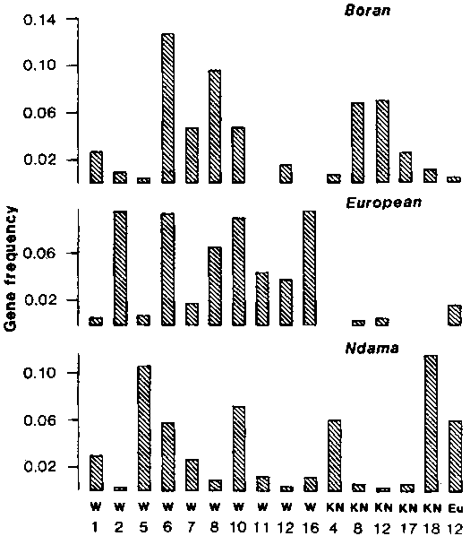 Recently we have reported a detailed comparative analysis of the MHC gene products of European taurine and African zebu types (Kemp et al., 1988). It is now apparent that there are clear differences in the BoLA profiles of the Gambian N'Dama by comparison with the European and East African animals and each of the major breed groups described therefore has some unique features in its BoLA profile. Thus the high frequency of KN18 is a particular feature of the N'Dama population whereas high frequencies of KN8 and KN12 are more typical of the East African Zebus. In some respects however, there are indications of similarities between the N'Dama population and the Zebu population on the one hand and between the N'Damas and the European cattle, on the other. This is illustrated by the occurrence of the KN104 gene in both the N'Dama and Zebu populations but not in the European breeds and by the occurrence of a particular w10 subtype in the N'Dama and European cattle which is not seen in the Zebus. In some cases there are no significant differences in frequencies within the three groups.