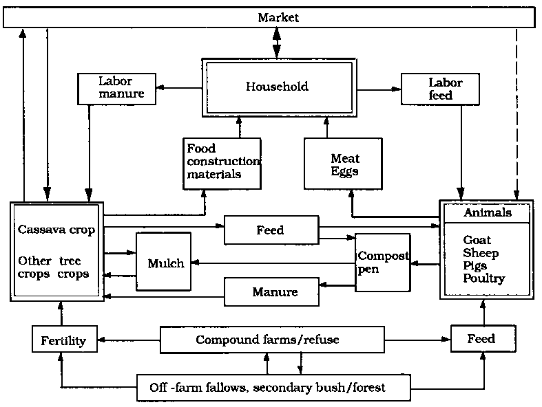 The interrelationships between crop-based production systems and livestock-based systems are illustrated in figure l, which shows a complex eastern Nigeria system, in which the family household is the major source of labor used for food crop and livestock production.