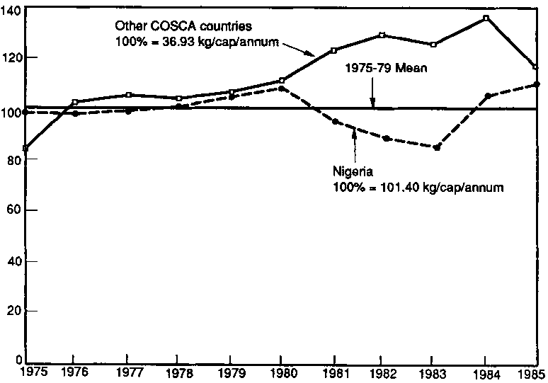 In 1985, the importation of food grains was banned and by 1986 the Nigerian currency was devalued so that although the ban on importation may not have been entirely effective, the consumer price subsidy resulting from the over-valued exchange rate was removed. Annual per capita consumption of cassava therefore increased in 1984 and 1985 beyond the 1976-80 average (table 2).