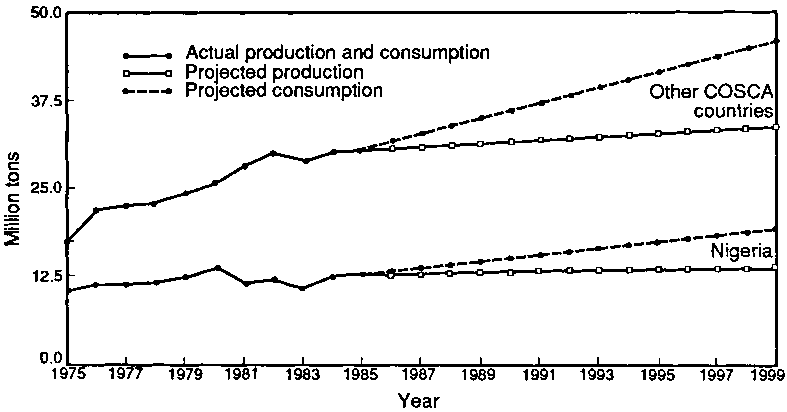 To determine the future importance of cassava in the food system of tropical Africa, we projected total production and consumption in COSCA countries to the year 2000, assuming that the 1975-85 cassava crop production trend would be maintained, and that the 1975-85 annual compound population growth rates would also remain. We also assumed an income elasticity of demand of 0. 5%.