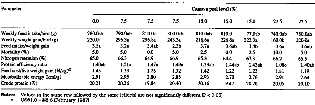 Studies conducted with cassava flour on poultry give conflicting results, particularly with young chickens. Satisfactory growth response has been obtained for growing chicks on inclusion of about 10 percent cassava flour in chick ration in most of the reported trials (table 1). Higher levels of inclusion of up to 50 percent have also given favorable responses in a few instances. A 40 percent inclusion of cassava flour in layers' rations has been found to be satisfactory for egg production.