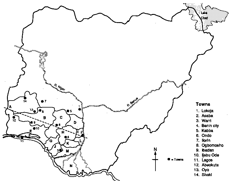 The southwestern portion of Nigeria lies west of River Niger and south of altitude 8°N. Though diverse, 14 areas (figure 1) can be distinguished that are uniform as regards people, agroecology, farming and food patterns. A straight line from near Ibadan, through Ohosu and Agbor approximately bisects the region (figure 1).