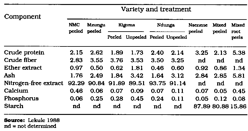 Roots: It is a common practice to sun-dry the roots when they have been chopped into small pieces. Peeled roots are normally fed to pigs and poultry while unpeeled roots are fed to cattle. The peel is rich in protein, fat and ash (table 3). Peeled fresh roots can be fed to pigs and poultry at low levels without any signs of toxicity.