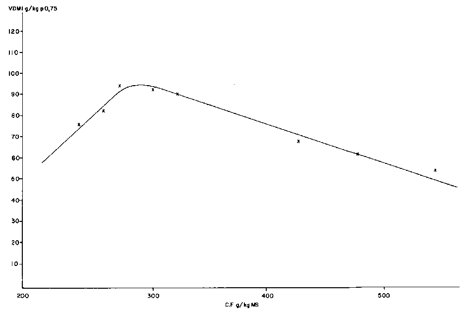 The ingestibility (DMI) of rations consisting essentially of groundnut hulls reached 125 g DM/kg W0.75 at an incorporation rate of 38.5%. At the equivalent incorporation rate (37%), rations based on cotton seed hulls recorded DMI values of up to 94 g DM/kg W0.75. This ingestibility varied with the content of crude fibre of which the optimum content for maximal ingestion was found to be 320 g per kg (Graph 1). This relationship has not been verified with groundnut hulls.