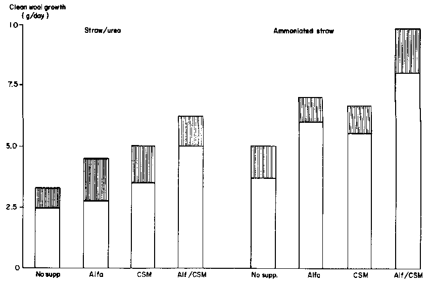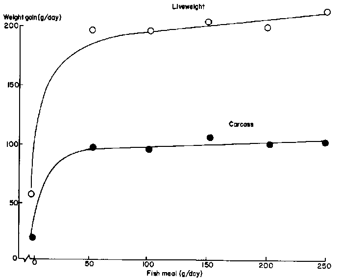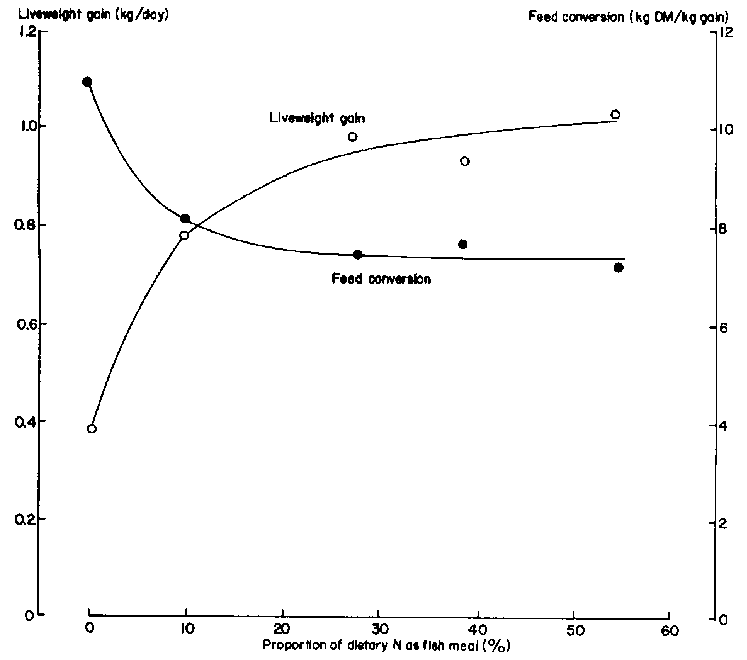 High growth rates cannot be supported on the products of fermentative digestion and bypass protein supplements are essential to take advantage of the VFA energy absorbed. Data taken from Bangladesh and Cuba demonstrate this rationale. Cattle on ammoniated (urea-ensiled) rice straw, when supplemented with only 50 g/d fish meal, increased their liveweight gain threefold (Figure 3). On a molasses-based diet of higher energetic potential, 450 g/d of fishmeal were needed to raise liveweight gain from 300 to 900 g/day (Figure 1).