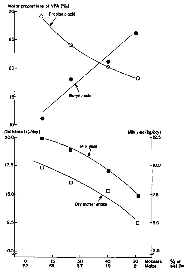 * The pattern of rumen fermentation, since this will determine the relative amounts of microbial protein to VFA that are produced and the proportion of propionic acid which is the main source of glucose;* The amounts of protein, starch and fat in the diet (more usually in the supplement), and the extent to which these nutrients escape the rumen fermentation