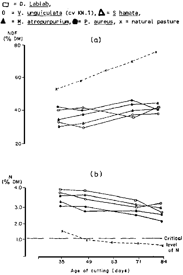 In general legumes are known to be less dependent on soil N for they obtain their N through biological fixation. As a result, the N content of all the legumes during the period of observation has always been above the critical level, for animal use, at all stages of growth compared to the natural pasture (Figure 3b). The critical level of N below which voluntary intake of DM is depressed is 1.12% (Whiteman, 1980). As expected there was a decline in the contents of N and increase in the contents of the cell wall components (Figure 3a). Differences were also noted in the solubility of DM due to species differences and stage of growth (Table 3).