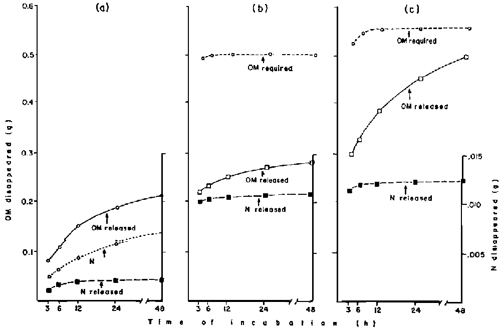 ARC (1980) estimated the ratio of RDN: ROOM required in the rumen to be 1:33.3. Based on this the OM and N releases of cowpea and millet stover were assessed for illustration purposes (Figure 4). In Figure 4 (a) it is noted that the OM released from the millet stover may not be utilised completely because of the inadequacy of N contained in it. Figure 4 (b) might illustrate a situation where cowpea N. is degraded rapidly and may not get adequate amount of OM released to match it, and the excess N could be lost in the urine. It is possible that the combination of the OM from cowpea and millet stover too may not provide adequate OM to match the N degraded (Figure 4(c)).