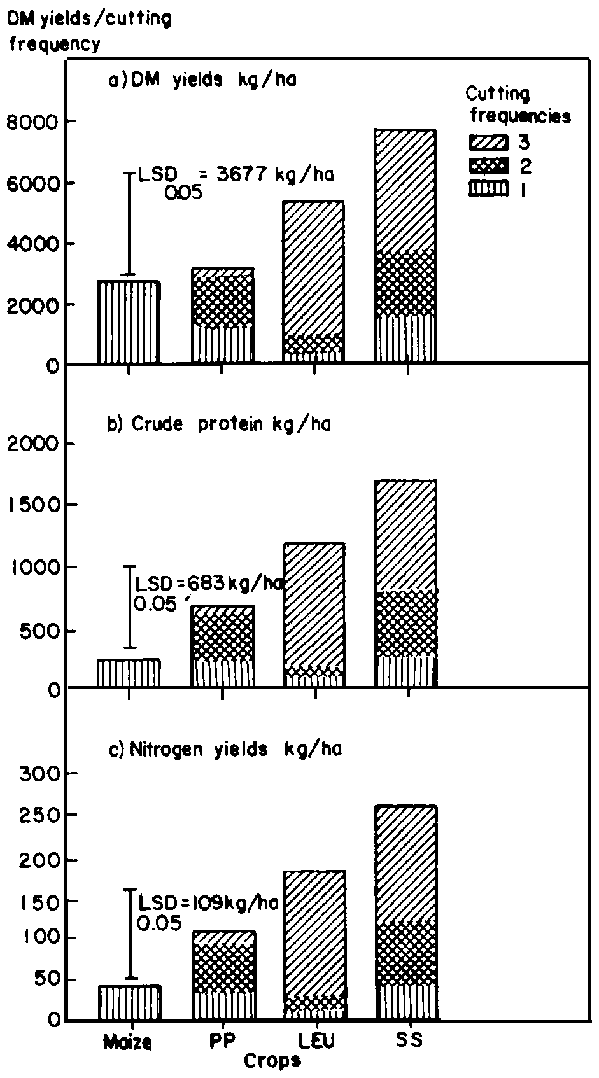 Figure 1. Cumulative DM, crude protein and nitrogen yields of maize, pigeon pea, leucaena and sesbania after three cuttings.