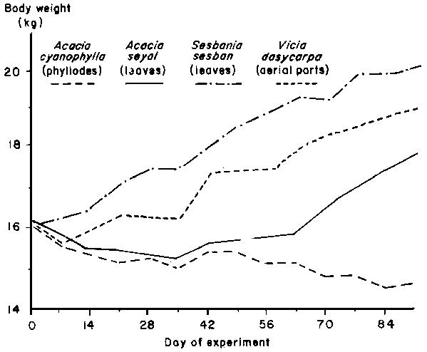 Nutritive values of forages of some Sesbania species are presented in Table 2. The range of CP in Table 2 is from 18.8% to 32.0% with a mean of 27.1%. The mean crude fibre content is low (13.0%) and the mean calcium to phosphorus ratio is high (3:8). It is therefore clear that Sesbania species have forages of very high quality. Results of Katiyar and Ranjham (1969), Chinnaswami et al. (1978) and Singh et al (1980) showed that digestibility coefficients of three Sesbania species were quite consistent when these were fed to sheep and goats (Table 3). DM and CP digestibility coefficients had means of 69.7 and 80.6 respectively. These results compare well with the DM digestibility coefficient of 74.3 that was reported on S. sesban from Maseno, Kenya by Sidahmed et al (1984). The high nutritive value of Sesbania forage was confirmed in a supplementation study at the International Livestock Centre for Africa (ILCA) in Ethiopia (Anon., 1986). In this study, teff (Eragrostis tef) straw was supplemented with leaf hays of three browse tree legumes - Acacia cyanophylla, A. seyal, S. sesban and Vicia dasycarpa on a sheep feeding trial. Sheep body growth rates showed that S. sesban hay was by far superior to all the other legumes: in fact sheep on A. cyanophylla supplementation lost condition (Figure 2a). Nitrogen balance in sheep showed that apart from cyanophylla, the other legumes were ranked for the amount of nitrogen retained as Vicia dasycarpa, Sesbania sesban and Acacia seyal (Figure 2b).