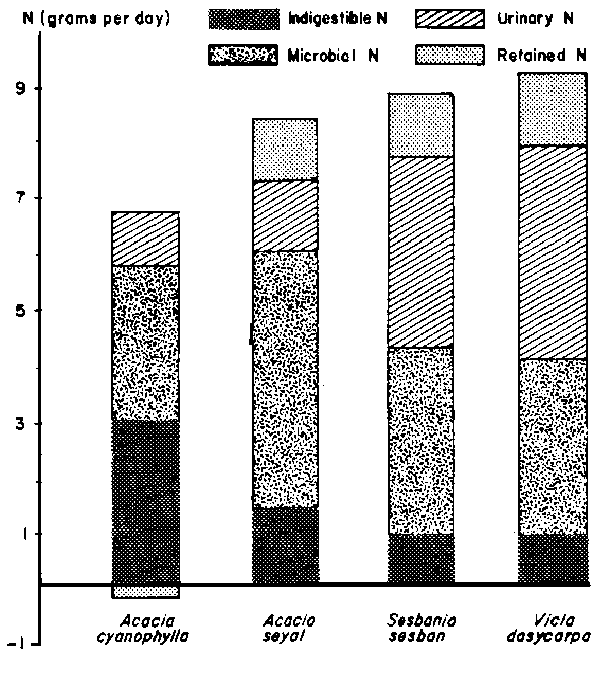 Several Sesbania species are an excellent livestock feed, both as fodder and hay (Onim et al., 1985). Dry-matter (DM) yields of Sesbania forage is quite high when compared to other forage legumes. Onim (1986) compared forage productivity of Leucaena leucocephala (cv Cunningham), pigeon pea (Cajanus cajan) and S. sesban at Maseno Research Station in western Kenya. The forage DM forage yields of the legumes after six months from planting were 8000, 5500 and 3000 kg/ha for Sesbania, Leucaena and pigeon pea respectively. Similarly nitrogen yields of these legumes were 250, 175 and 120 kg/ha for Sesbania, Leucaena and pigeon pea respectively (Figure 1).