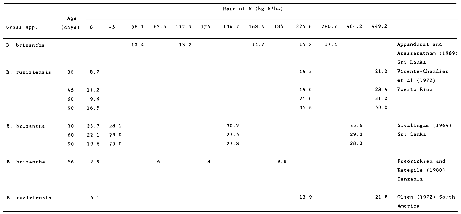 Although no systematic studies have been carried out to evaluate the nutritive value of Brachiaria spp. a number of studies has shown that the species is of high nutritive value. Frederiksen and Kategile (1980) reported about 800 kg CP/ha in the fifth week of regrowth (Table 2) and Nnko, (unpublished data) working on the same plots, which were now 20 years old, reported 400 kg CP/ha at a fertilizer application rate of 105 kg N/ha at eighth week of regrowth. Elsewhere higher yields of CP have been reported with higher N fertilization. In Puerto Rico, Vicente-Chandler et al., (1972), reported yields of 3.5 t of CP/ha at a fertilizer rate of 896 kg N/ha and 60 days cutting intervals for B. ruziziensis. The rate of N fertilizer will certainly be dictated by the economics in a particular area, but if comparative studies are to be conducted with other grass species such as Chloris gayana, Brachiaria spp. is likely to outperform them in this respect.