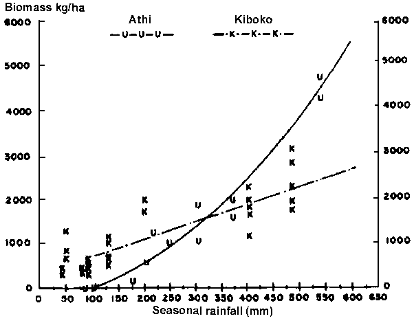 However, responses to rainfall in Tsavo were twice as high as in Kiboko (8.0 and 4.1 kg DM/mm of rain respectively) although the latter site receives more rainfall. This is most likely due to differences in grass cover density. The average density in Tsavo was 60% whereas Too (1985) reported that herbaceous cover in his trial area varied from 15-40%.