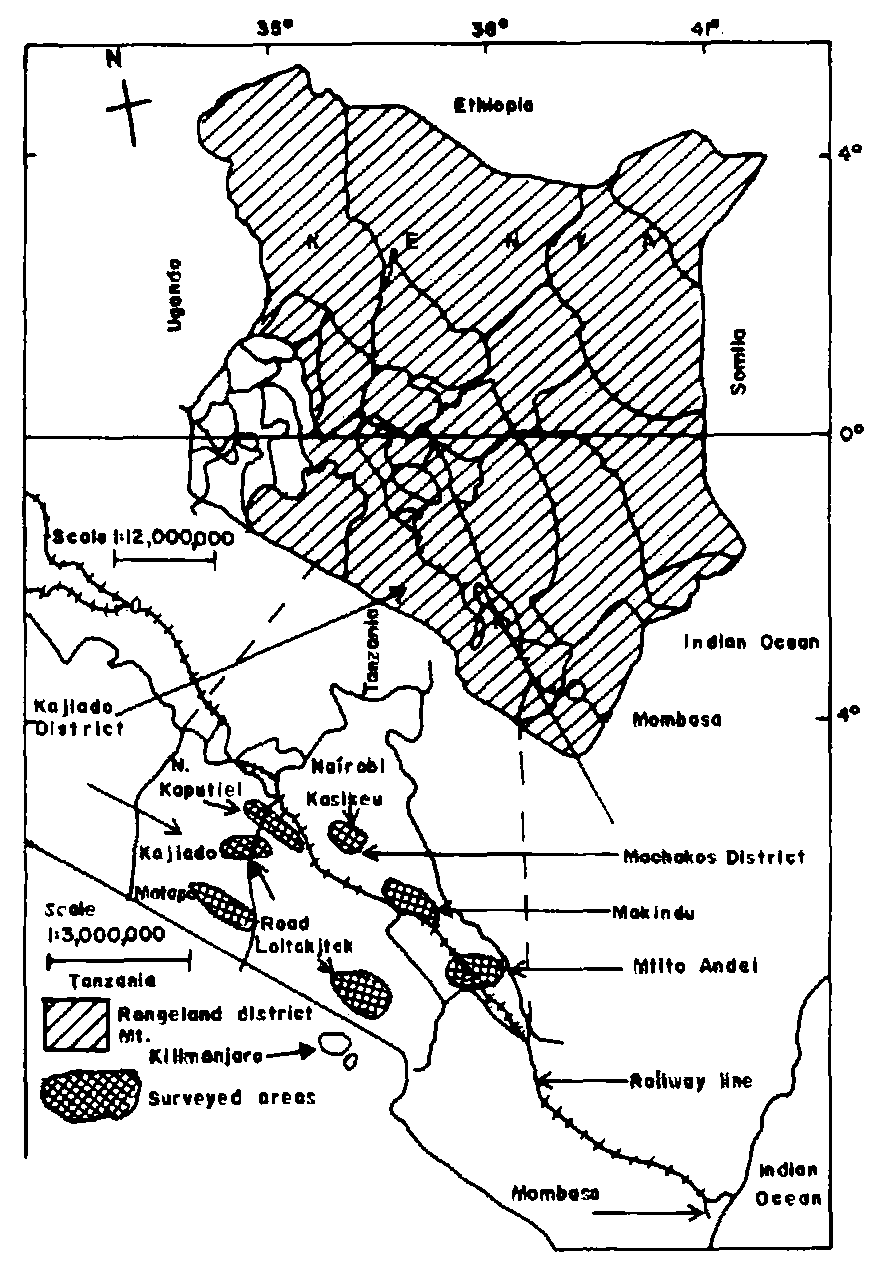 Figure 1. Surveyed areas in Kajiado and Southern Machakos Districts in Kenya.
