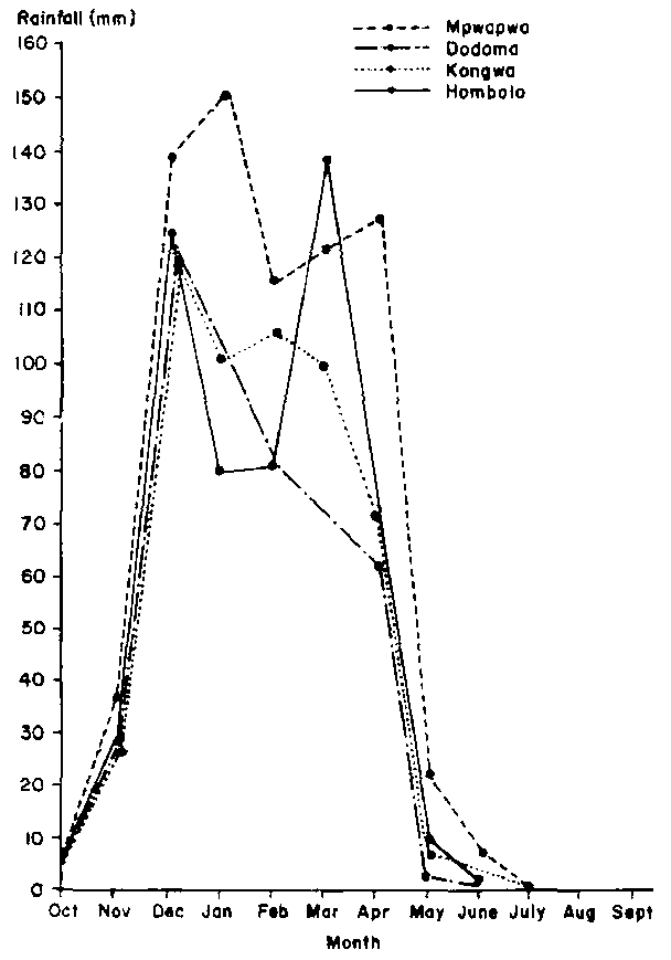 Central Tanzania covers an area of 140,000 km² in the central semi-arid plateau, between latitudes 4° and 7°S and longitudes 33° and 37°E (Figure 1). The plateau lies at an elevation of 750-1500 m, the eastern boundaries of which are steeper escarpments rising to 1750 m above sea level. The area has a dry savannah type of climate with a long dry season between April and November, and a short wet season from November to April (Figure 2). The total annual rainfall ranges between 250 mm to 750 mm with an average of 600 mm. The distribution is very erratic and reliability is low. Average temperatures are 20-25°C with a diurnal range of 12°C. Apart from the extensive areas of alluvium the two main soil types are a greyish sandy and red sandy loam textured. Severe leaching and laterisation are a common feature of the area. Natural vegetation consists of a dense deciduous thicket with Commiphora and Acacia as the dominant genera.