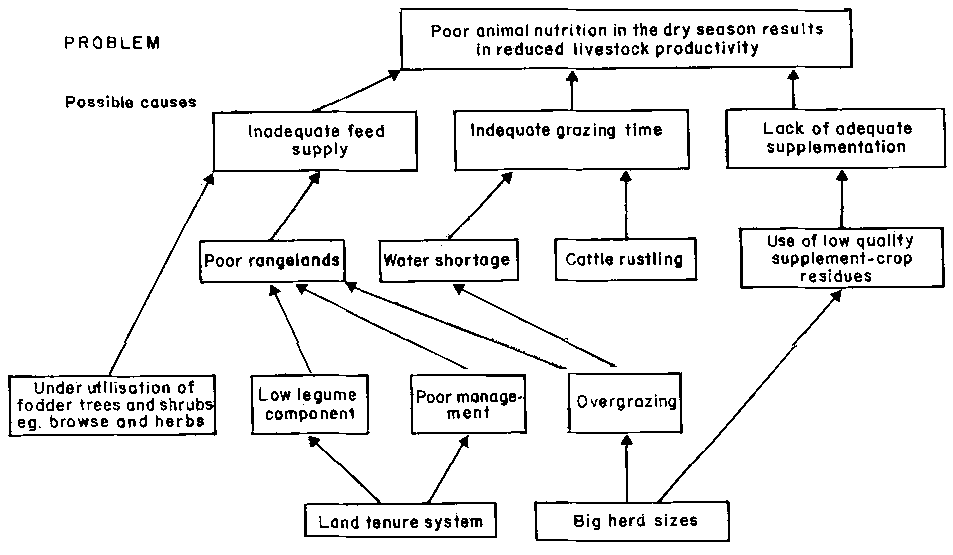 Poor animal nutrition particularly in the dry season came out as one of the major constraints to livestock productivity in the study area. This view is supported by the low milk production in the dry season. Whereas, 1.4 litre per cow per day could be produced in the wet season, milk production in the dry season was negligible. The slow growth rates leading to attainment of mature weights in seven years could partly be due to poor nutrition also. Furthermore, movement of animals to distant grazing areas in the dry season results from the feed shortages. This problem can be described with the causes shown in ovals diagrammatically (Figure 3). There can be many causes to this problem and some of the causes are interrelated. Three major causes to the problem have been identified in the current study: inadequate feed supply, inadequate grazing time and lack of adequate supplementation.