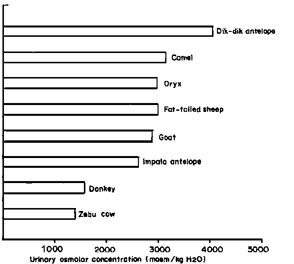 Figure 3. The maximal urinary osmolar concentrations of several East African mammals under severe dehydration. (Source: Maloiy (1972)