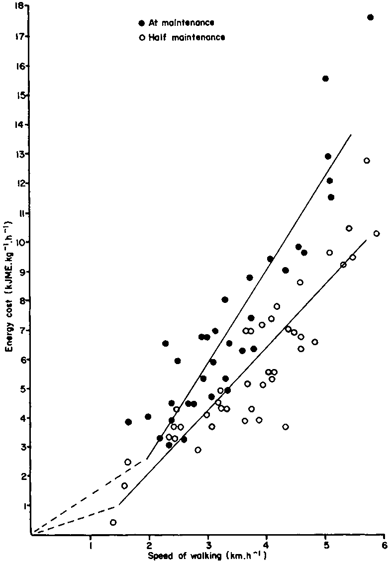 The energy cost of walking per horizontal km is similar for Bos taurus and Bos indicus cattle on a diet at or above maintenance. The most efficient speed is between 2.5 and 3.5 km. h-1 when the cost is 1.8 kJ.kg-1 (Ribeiro et al, 1977; Finch and King, 1979). At faster and slower speeds the energy cost per metre increases.