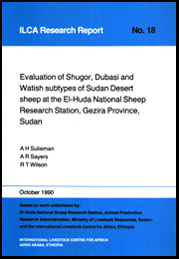 Correct citation: Sulieman A H. Sayers A R and Wilson R T. 1990. Evaluation of Shugor, Dubasi and Watish subtypes of Sudan Desert sheep at the El-Huda National Sheep Research Station, Gezira Province, Sudan. ILCA Research Report 18. ILCA (International Livestock Centre for Africa), Addis Ababa, Ethiopia. 38 pp.