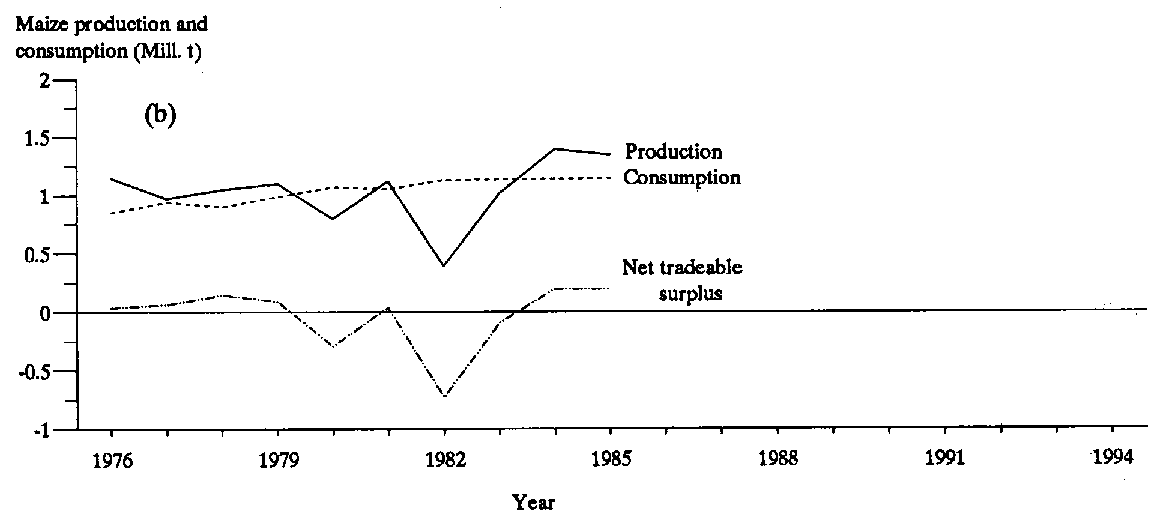 Question 1. On Figure 3.10b, draw trend lines for maize production and consumption, and extrapolate values for 1990 and 1995. Enter these values in the table.Question 2. On a separate sheet, derive and plot consumption per caput and extrapolate its trend to 1990 and 1995.