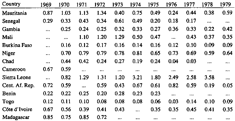 Table 6.9 summarises trends in the coefficient of efficacy over the period 1969-79 for 14 West African countries. In all but two cases, the coefficient declined over the period. Similar patterns were observed in East Africa and in Zambia. This decline represents both a failure on the part of governments to provide the necessary operational funds to support staff activities and a failure on the part of animal health services to limit staff numbers and salaries.