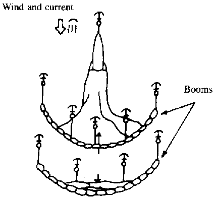 The harbour master must ensure that adequate containers are strategically placed within the harbour complex for collecting the litter. It is advisable to have separate containers to facilitate the segregation of waste into recyclable dry waste, wet organic waste that can be composted and hazardous waste which needs special care in disposal. Floating garbage is best collected by small boats using a scoop net or as the figure below shows, two vessels working together using a floating net boom.