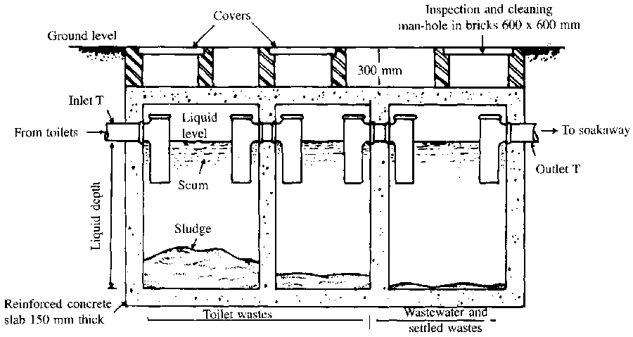 After coarse screening through a basket sump, the effluent is retained inside the compartments for a minimum period of three days; during this period, the solids in suspension settle to the bottom of the first compartment where they are attacked and digested by bacteria. As a result, the volume of sludge is greatly reduced and the effluent clarified to some extent. Appropriate manholes should be provided over each compartment to enable sludge to be removed (pumped out) during maintenance.