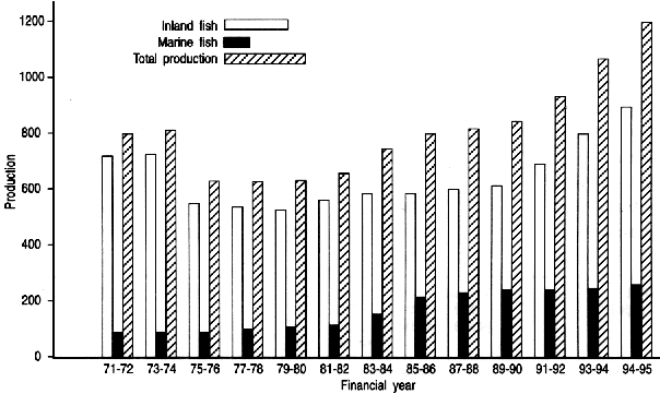 The inland waters in Bangladesh are, reportedly, the abode of 258 indigenous and eight exotic species of fish and 22 major species of prawn as well as of different species of turtles, crabs and other varieties of shellfish. The Bay of Bengal, along the Bangladesh coast, is reported to be the habitat of 475 species of fish and 38 species of shrimp. Fish production in 1994-95 has been estimated at 1.2 million tonnes, comprising of inland open waters, 0.58 million tonnes, closed waters 0.92 million tonnes and marine waters 0.27 million tonnes. The details of yearwise fish production in Bangladesh are shown on the facing page.
