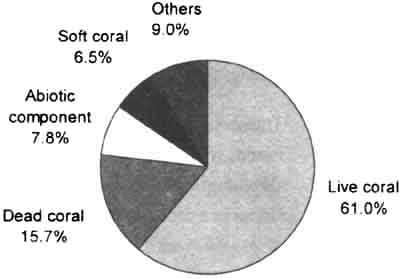 The reef flat consists predominantly of isolated patches of stunted Porites spp. boulders, interspersed by a sandy bottom. The reef flat gradually slopes down to a narrow fore reef which continues at a steeper gradient to a sandy sea bottom. Massive corals such as Porites spp. and branching staghorn corals (Acropora spp.) form the bulk of the fore reef and reef slope areas. |