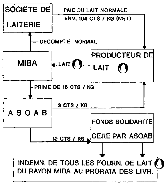 Concrètement: celui qui achète des bio-yoghourts au lait entier MIBA paie une prime de 15 centimes par litre de lait transformé en produits biologiques. Cette prime est intégralement versée sur un fonds de compensation des prix géré par l'ASOAB. Grâce à ce fonds chaque fournisseur de lait de la MIBA travaillant conformément au' Cahier des charges de l'ASOAB bénéficie d'une prestation financière supplémentaire, proportionnelle à ses livraisons de lait.