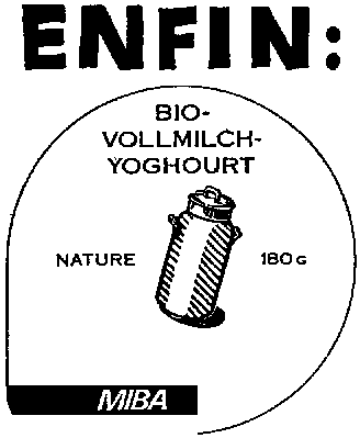 Depuis le début de l'été 1988, le commerce de détail du nord-ouest de la Suisse (Coop Bâle ACV, Migros Bâle et MIBA) proposent, en gobelets de 180 grammes, des bio-yoghourts MIBA au lait entier portant le label "Bourgeon". Le lait servant à la fabrication de ces yoghourts provient d'exploitations travaillant selon le Cahier des charges pour la commercialisation des produits de l'agriculture biologique, édité par l'Association Suisse des Organisations d'Agricultures Biologiques/écologiques (ASOAB). Cette action pilote a pour but de permettre à la Fédération laitière MIBA et aux grandes chaînes de distribution participantes de savoir dans quelle mesure les difficultés économiques, écologiques et politiques de l'agriculture suisse peuvent être résolues à partir du marché.